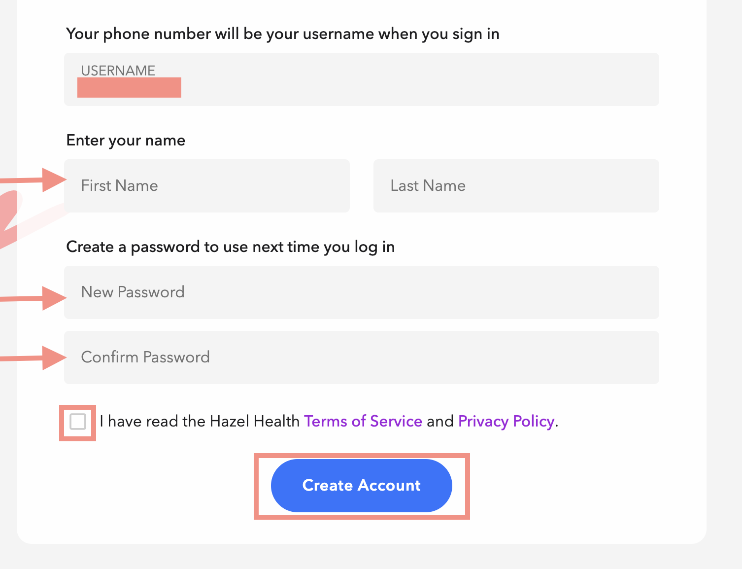 The bottom of the page will open up after you put in the info above, this is where you will enter your name, create a password, and read our terms and privacy policy.
