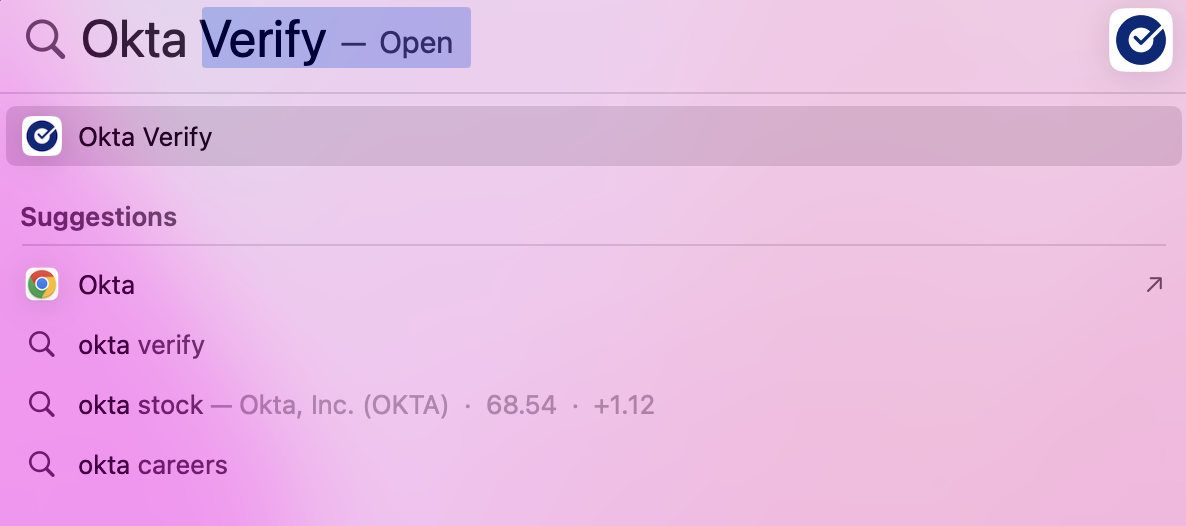 - Click Enter to open “Okta Verify” or select it from the app option that appears under the search bar.