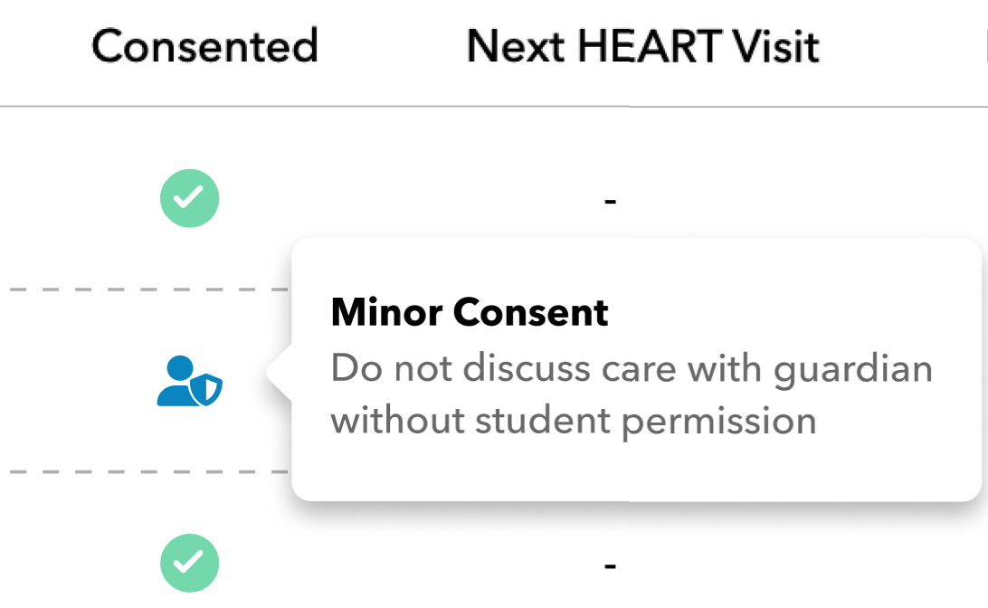 Under the “Consented” column you can clearly identify a minor consent referral with an icon of a person with a shield. Hover your cursor over the shield to get a detailed description of what the icon means.