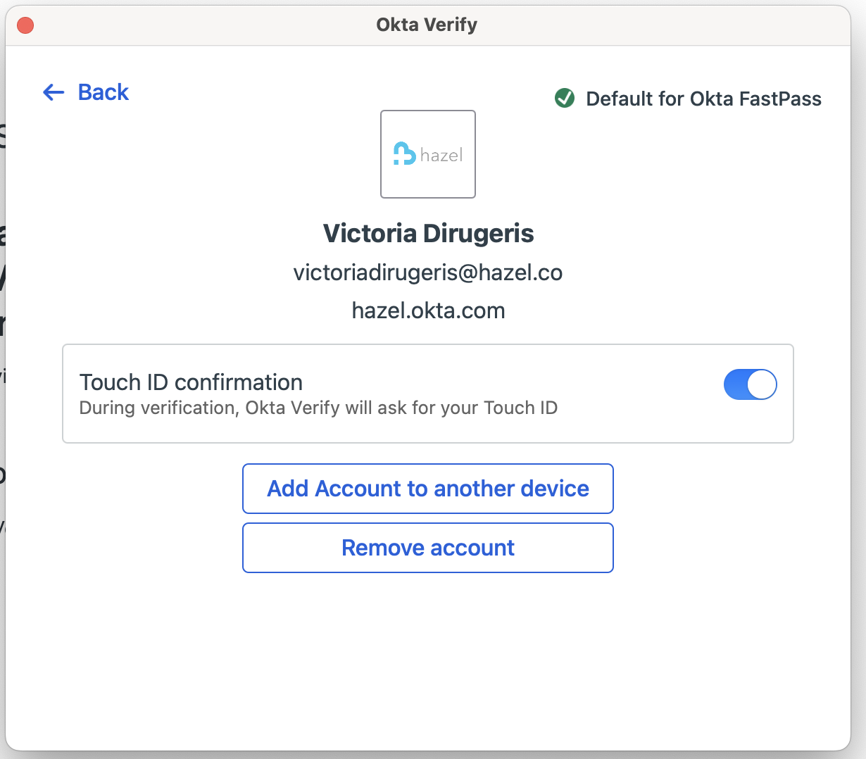 When you toggle this setting on in Okta Verify, your device should automatically prompt you to set up your TouchID or FaceID so that this feature can work.