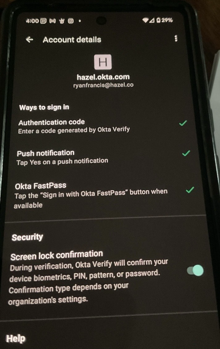 Logging in to Sigma at Hazel REQUIRES that the device you are using for Okta Verify has Biometrics set up, and enabled in the Okta Verify App.